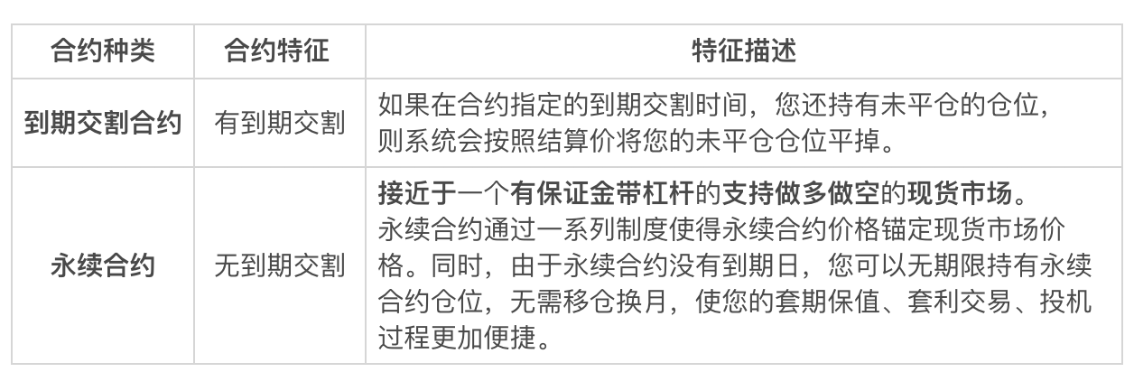 按照合约到期日,可以将合约分为“到期交割合约”和 “永续合约”两种。那这两种合约分别有什么特点呢?