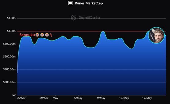 如今距离Runes协议主网上线已有1个月,但据GeniiData数据显示,Runes生态总市值目前仅为9.35亿美元,且Runes生态总市值长期均值从未突破10亿美元,9日均值曾达到9.986亿美元高点,18日总市值则曾短暂突破10亿美元,但当日均值为9.936亿美元。