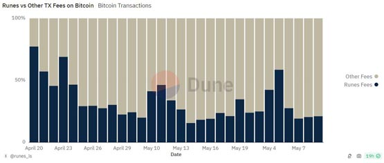 在巅峰时期,符文相关交易在整个比特币交易手续费中的占比高达80%,但如今仅剩20%。