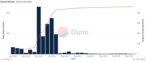备受瞩目的符文协议(Runes)在上线之初,一度掀起蚀刻热潮,Dune Analytics数据显示,在最初10天里,有高达85,000多个代币透过该协议发行,产生超过300万美元的手续费用。