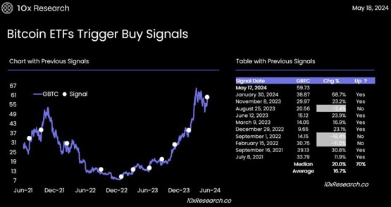 根据10x Research的推文,其以比特币ETF(GBTC)为模型的交易讯号已被触发。虽然此模型并非每个交易讯号都会成功,但一般来说,它们以70-80%的机率在平淡的交易区间可能结束时,可为投资者提供及时的提醒。该模型最后一次触发是在2024年1月30日,当时GBTC上涨了68.7%。