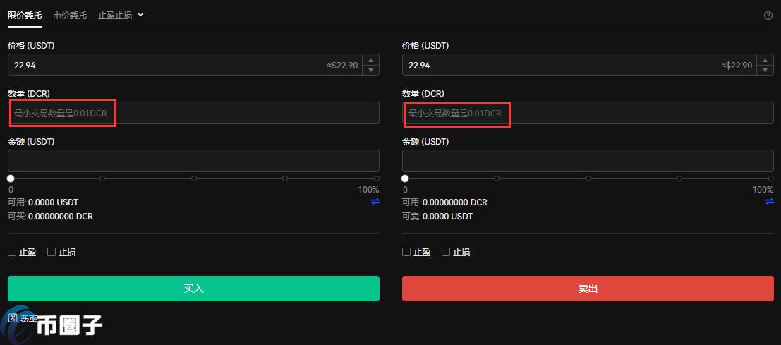 7.若是买入,填写DCR购买数量,点击买入,若是卖出,填写DCR卖出量,点击卖出即可。注意:DCR最小交易数量是0.01DCR