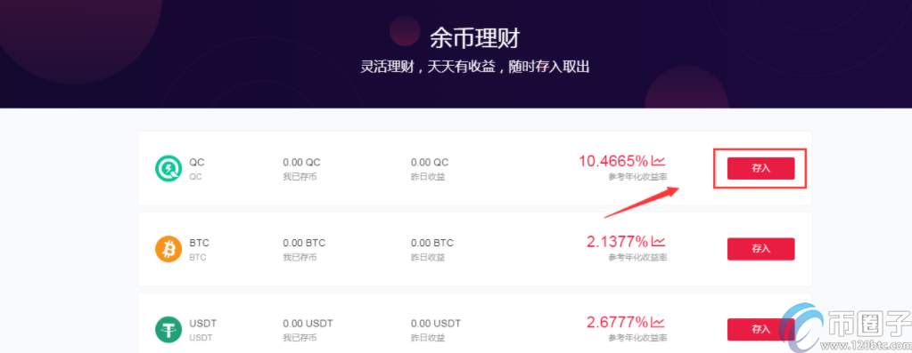 2、理财存入。以 QC ( 快钱 )为例,点击 QC ( 快钱 ) 项目的“存入”。
