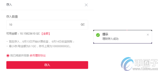 3、输入存入数量(QC),阅读并勾选“我已阅读并同意 余币理财协议 ”,点击“存入”,即为理财存入成功。
