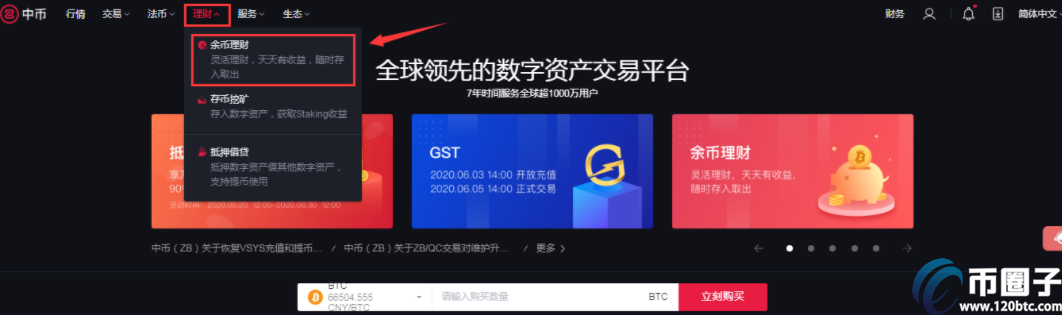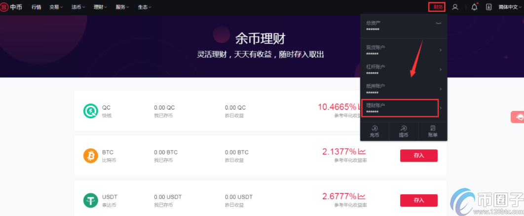 1、打开ZB官方网站登录账户,点击“理财”导航栏中的“余币理财”。