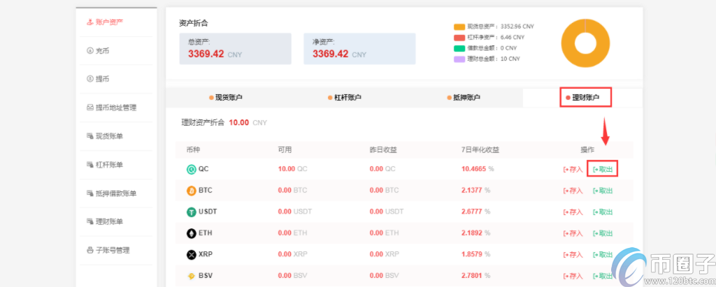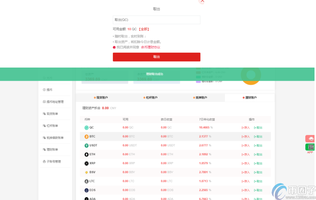 6、输入取出金额(QC),点击“取出”,即为理财取出成功。