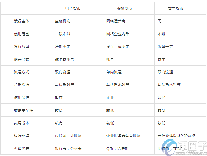比特币的出现对已有的货币体系提出了一个巨大挑战。虽然它属于广义的虚拟货币,但却与网络企业发行的虚拟货币有着本质区别,因此称它为数字货币。从发行主体、适用范围、发行数量、储存形式、流通方式、信用保障、交易成本、交易安全等方面将数字货币与电子货币和虚拟货币进行了对比 。