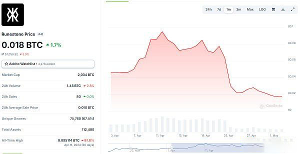 据CoinGecko数据显示,Runestone地板价最高曾在4月11日飙升至0.095 BTC,但在4月21日即从0.0775 BTC近乎直线下跌,目前仅为0.018 BTC,降幅高达81%。