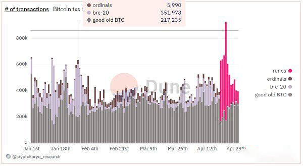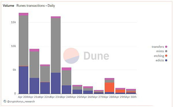 据Dune用户@cryptokoryo_research提供的图表显示,自4月20日比特币网络上有符文交易量以来,仅在4月23日到达顶峰,Runes 日交易量超 75 万笔,但此后一路下滑,4月30日为9.3万笔。