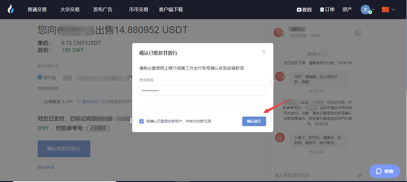 第八步,买家点击“我已付款”按钮后,请仔细核查款项是否到账。确认到账后,再点击“确认收款并放行"。