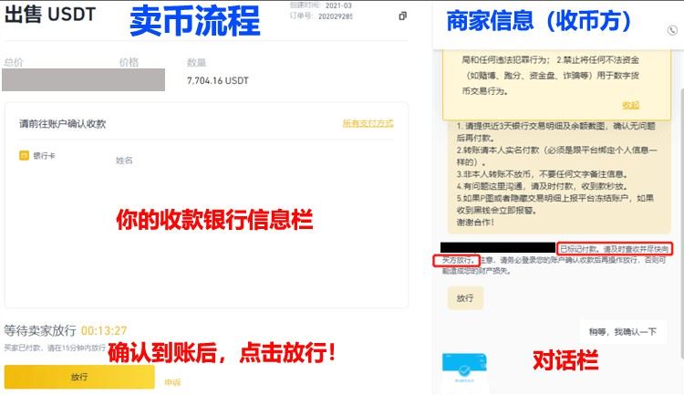 点击卖出USDT的订单后,商家会按照你的收款方式支付(一般几分钟内完成),商家付款后会在“放行按钮”和对话栏上方都有提示。按照提示交易即可,等待对方付款后,放行即可!更多法币买卖比特币/USDT详细可以参考币安官网视频教程。