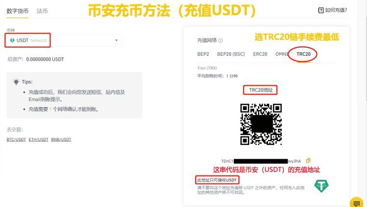 打开币安USDT的充值地址后,要选一个转账的链,大部分数字货币交易所都支持ERC20、OMNI、TRC20三条链,每个链的所对应的地址都不一样。这里以TRC20为例(手续费最低1USDT)。
