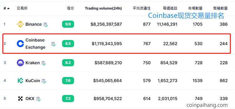 目前,Coinbase在Coinmarketcap上现货交易量排名稳居第二,仅次于Binance。