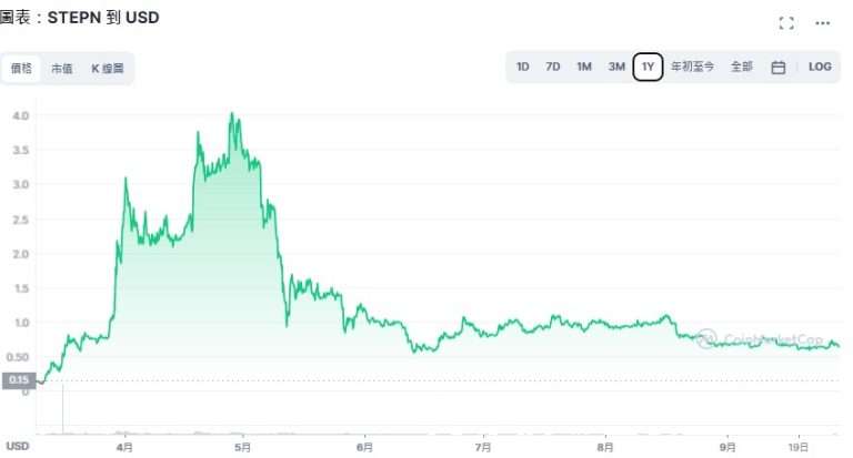 GMT币是热门M2E链游STEPN的治理代币。STEPN于2022年3月启动,一度引起了Move to Earn游戏的热潮,其代币GMT的价格也在该年4 月底达到最高点,然后回落至略高于IPO水平的区间。
