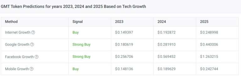 在最好的情况下,如果跟随Facebook 等大型科技公司的增长, 2025 年的GMT 价格预测为1.263215 美元。如果GMT 代币跟随互联网增长,那么2025 年的预测将是0.248998 美元。
