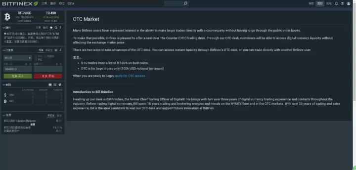 笼统地说,Bitfinex的交易可以分为四种:兑换交易、杠杆交易、OTC(Over The Counter, 场外交易)、融资。