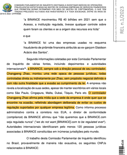 在报告中,由副主席 Ricardo Silva 领导的委员会声称,币安、赵和其他人“建立了一个不透明的法律实体网络,所有这些实体都由赵直接或间接控制,没有明确的商业目的,除了逃避合规之外没有其他目的”与法律。”