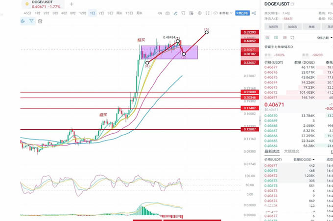 狗狗币目前在0.4美金徘徊震荡,根据狗狗币的形态走势来看,中期依旧是持续往下走的。