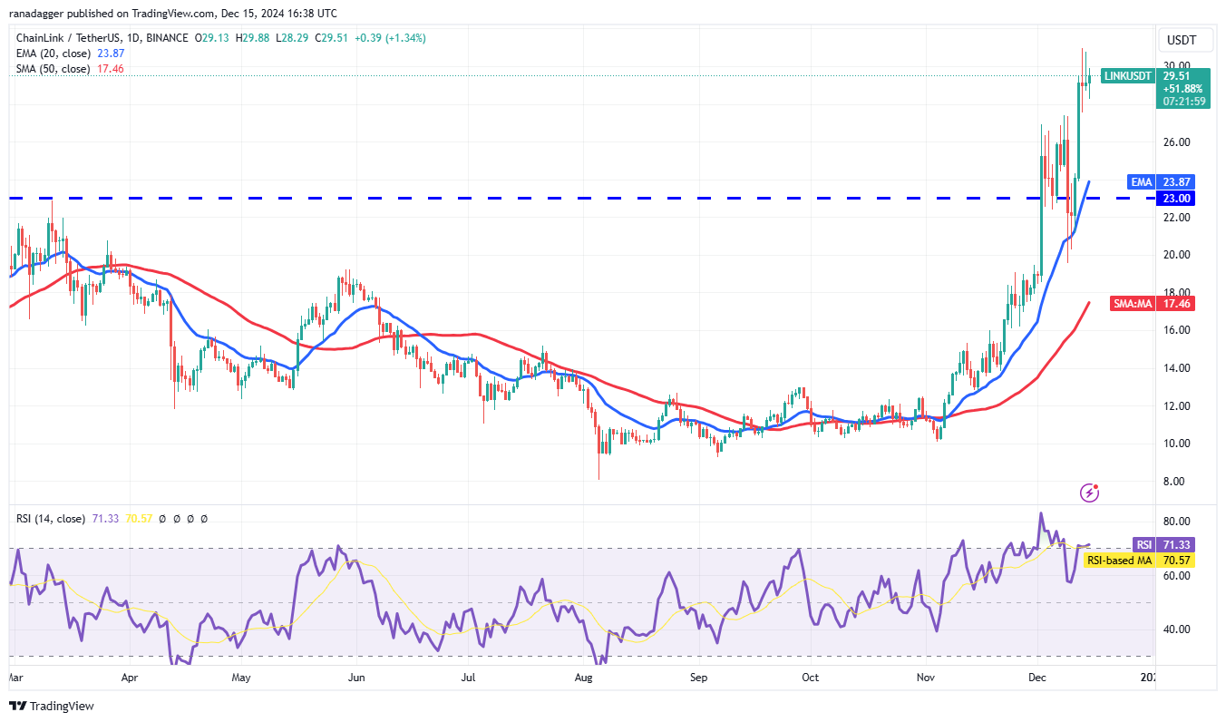 Upadhyay 指出,Chainlink($LINK)正处于上涨趋势,但在12 月13 日、14 日出现较长的上影线,这代表30 美元上方有较大卖压。