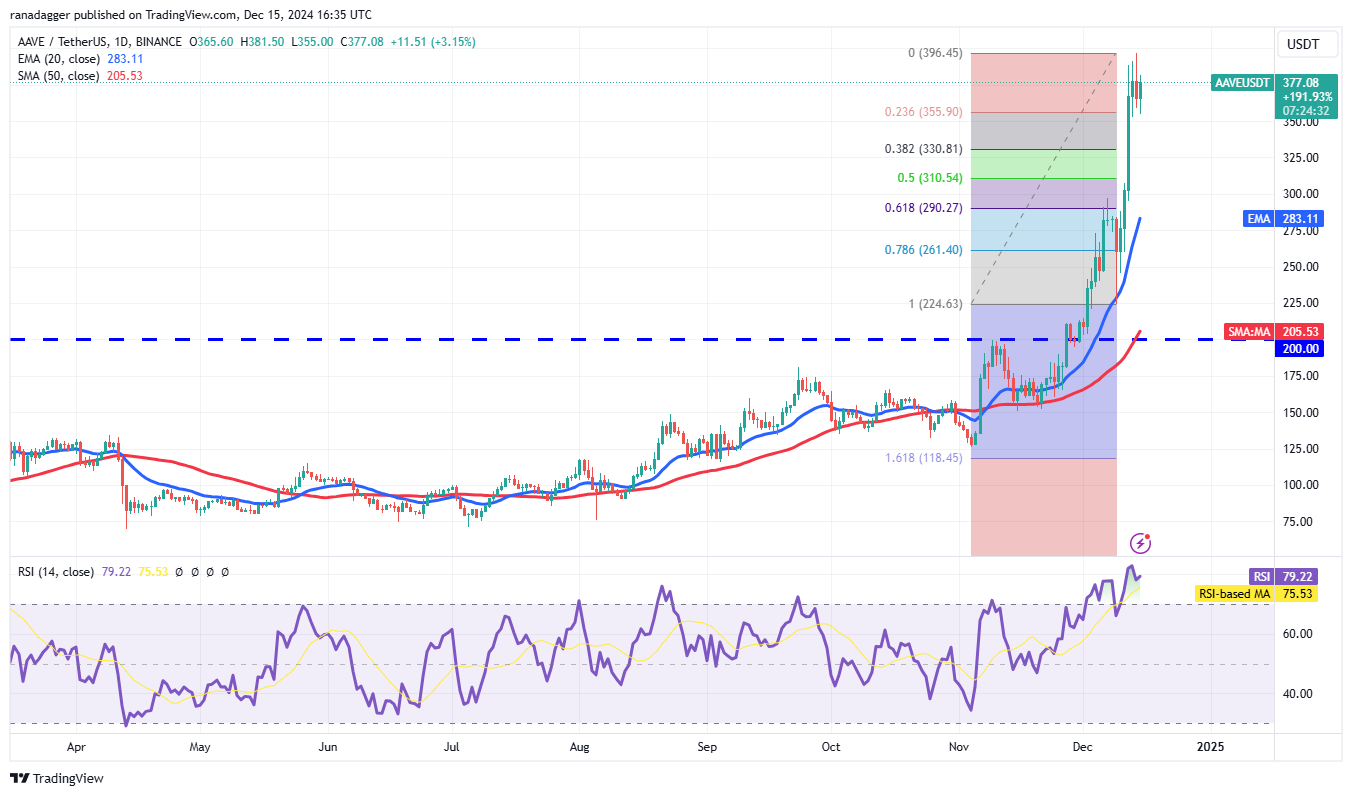 Upadhyay 指出,Aave($AAVE)在12 月10 日从20 日EMA 处(283 美元)反弹,并在隔日突破近期阻力位300 美元。