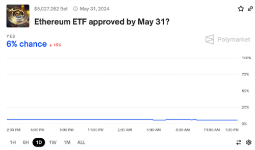 尽管今年早些时候市场对于以太坊ETF的批准持乐观态度,但随着5月23日这一关键截止日期的临近,分析师们对于SEC批准现货以太ETF的可能性越来越表示怀疑。据纽约加密货币预测平台Polymarket的数据显示,高达92%的参与者认为现货ETH ETF的申请将被SEC拒绝。