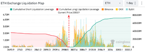 此消息一出,交易者们纷纷增加空头头寸,预计价格在短期内可能继续下跌。市场清算图显示,如果价格上涨3%,将有3.45亿美元的空头头寸面临清算风险。相反,如果价格下跌3%至2,920美元,多头头寸的损失则预计为2.37亿美元。