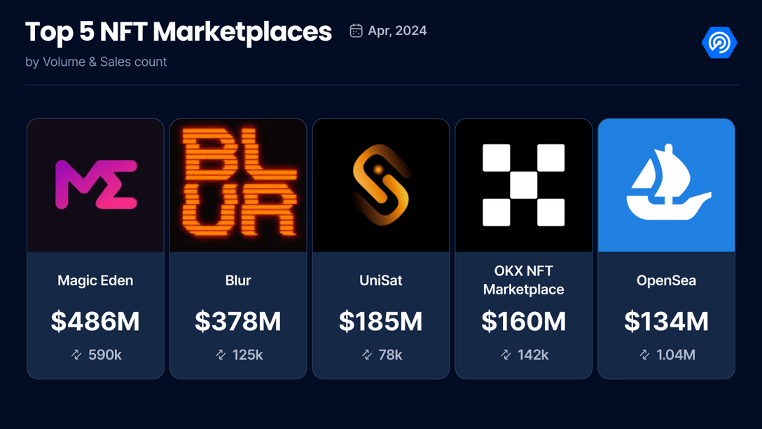 根据DappRadar 2024 年 4 月 Dapp 行业报告,Magic Eden 的交易额超过 Blur 1.08 亿美元。这一激增归因于 Magic Eden 对比特币序数的战略扩张及其强大的奖励计划,吸引了交易者和收藏家。该平台整合了比特币序数交易(目前占其总交易量的 70%),凸显了这种新资产类别在 NFT 领域日益受欢迎。