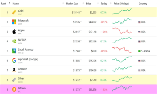 当比特币在2024年达到峰值(迄今为止)71121美元,并创下历史新高时,它曾短暂地以市值超越了白银,成为全球第八大最有价值的商品。