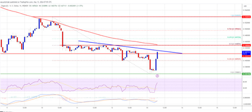 低点在0.1358美元形成,DOGE正试图反弹。在阻力位0.1420美元上方有小幅上涨。从0.1538美元的高点到0.1358美元的低点,价格攀升至23.6%的斐波那契回撤位上方。