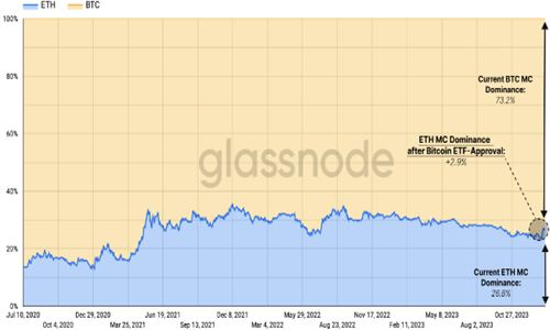 Glassnode指出,这种表现与ETH市场主导地位的反弹相吻合。根据下图,自现货比特币交易所交易基金(ETFs)获得批准以来,ETH相对于比特币的市场主导地位增加了2.9%。
