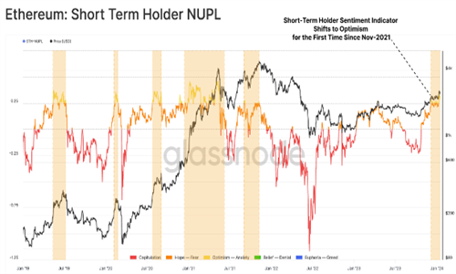 支持ETH积极情绪的最重要指标可能是短期代币持有者的净未实现盈亏(NUPL)指标。