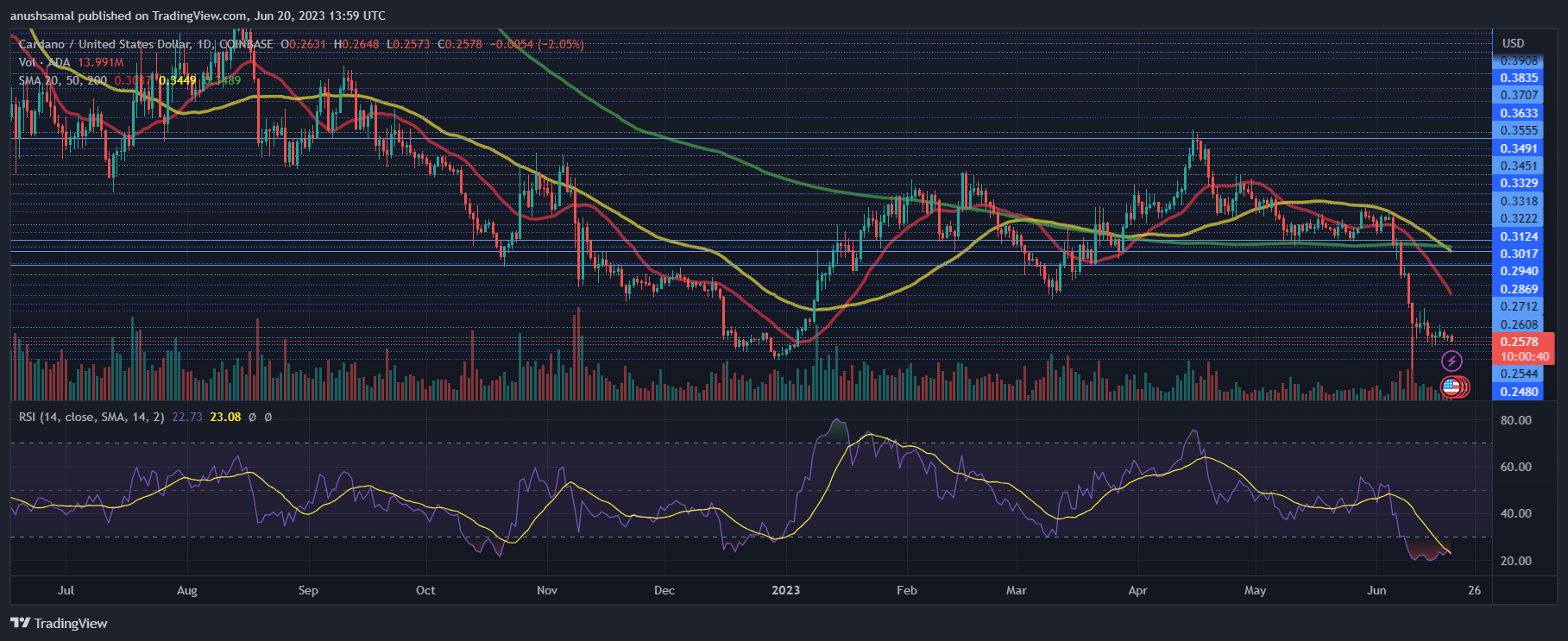 目前,ADA 一直在努力恢复投资者信心并显示出复苏迹象。相对强弱指数 (RSI) 已跌破 30 关口,表明处于超卖状态。这表明抛售压力持续存在,投资者情绪依然疲软。