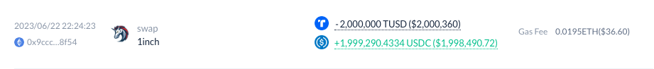 因为目前没有交易所提供TUSD的永续合约,对于交易、对冲TUSD的策略有限,但据链上数据显示,一位巨鲸使用决定利用Aave v2借贷平台放空TUSD,他首先将750万美元的USDC稳定币作为抵押品存入,并立刻借出400万美元的TUSD,随后立即从1inch将其出售获得USDC。