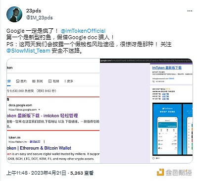 4 月 21 日消息,慢雾研究员 @IM_23pds 在社交媒体上发文表示,当前谷歌搜索「imToken」后的置顶广告为新型钓鱼网站,提醒用户切勿点击链接,注意规避风险。