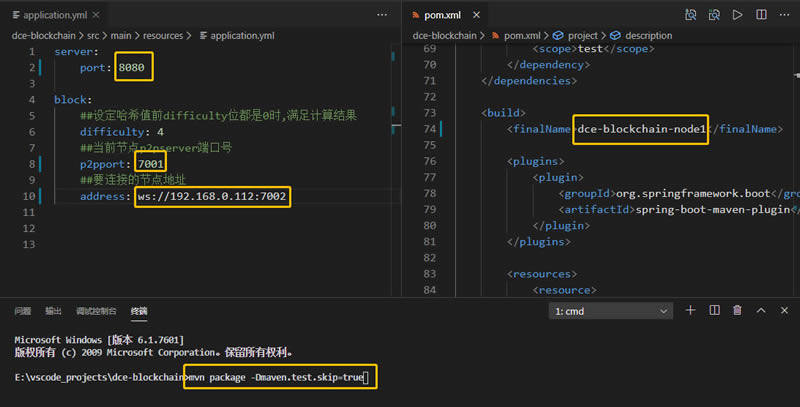 然后,一个节点启动时,会寻找区块链网络上的有效节点,并建立socket连接(BTC网络可以通过使用“DNS”种子方式获取BTC有效节点,DNS种子提供比特币节点的IP地址列表),我们直接把节点列表配置到application.yml文件中。