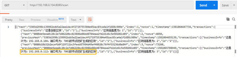 最后,我们来验证节点2是否已经完成了节点1生成的区块链信息的网络同步,Postman执行http://192.168.0.112:8090/scan请求,查看返回结果: