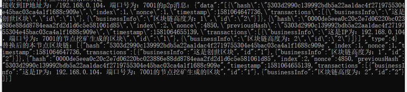 从结果可以看到,区块链网络节点2已经接收到节点1发送的区块链信息,系统日志如下: