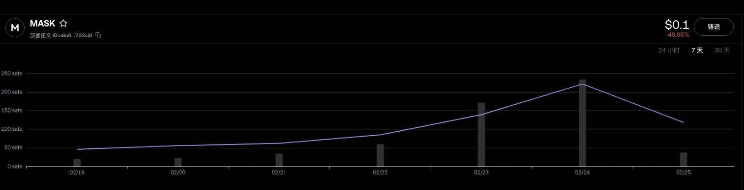 BRC-20代币MASK部署于2023年3月10日,即使在BRC-20铭文最火爆时期也未完成铸造,部分玩家去年甚至在30聪/字节的高铸造费率下被套牢。