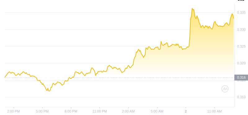 截至 2025 年 1 月 2 日 13 时,狗狗币 (DOGE) 的价格为 0.33 美元,24 小时的交易量超过 23 亿美元。与前一天相比,其价格上涨了 5.6%。
