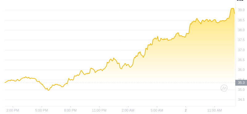 Avalanche (AVAX) 截至 2025 年 1 月 2 日下午 13:00 时为 38.97 美元。其 24 小时交易量为 36.85 亿美元,在过去 24 小时内上涨了 10.26%。