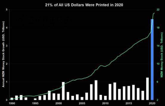 究其背后的原因其实我们不难发现,主要是因为各国央行为了刺激经济而进行的大规模量化宽松政策所致,也就是我们常说的——各国央行又开启了他们的"核动力印钞机",不停的想市场撒钱。这其中作为全球最大经济体的美国撒钱最多。总下图我们可以得知——全世界21%的美元都是今年印出来的!大约印了4.5万亿美元。