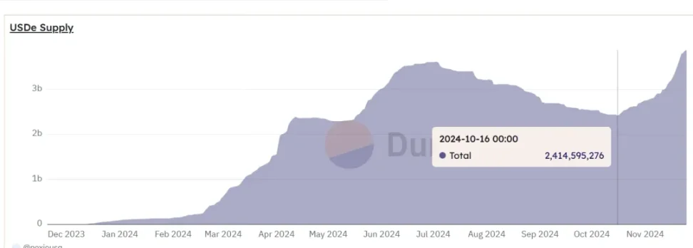 过去的一个月中,USDe 发行总量由 24 亿美元增加至 38 亿美元,实现超 58% 的月度增长。其底层逻辑是 BTC 突破新高以后,做多情绪浓烈,资金费率的提升拉高了 USDe 的质押收益率,并带来 USDe 的增长。尽管较前几日有所下降,11 月 26 日 Ethena 官网显示的 APY 有 25% 左右。