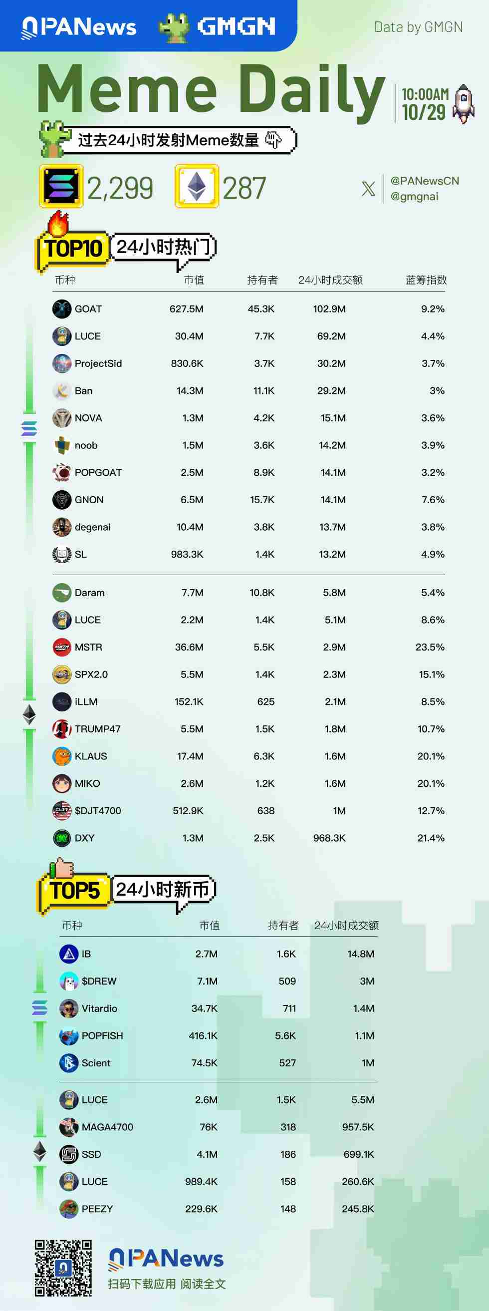 panews 联合 gmgn.ai 推出全新数据内容「meme日报」,一图掌握meme板块热度分布,包含过去24小时meme发射数量、热度top10排行、新币top5排行,以及项目市值、持仓人数、交易量、蓝筹指数等关键指标。