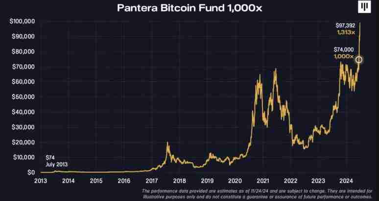 在2013 至2015 年间,Pantera Capital 的比特币基金的持有量为全球供应量的2%,随着比特币一度突破9.9 万美元,在扣除所有费用和开支后,Pantera Capital 的初始投资已增值131,165 %。