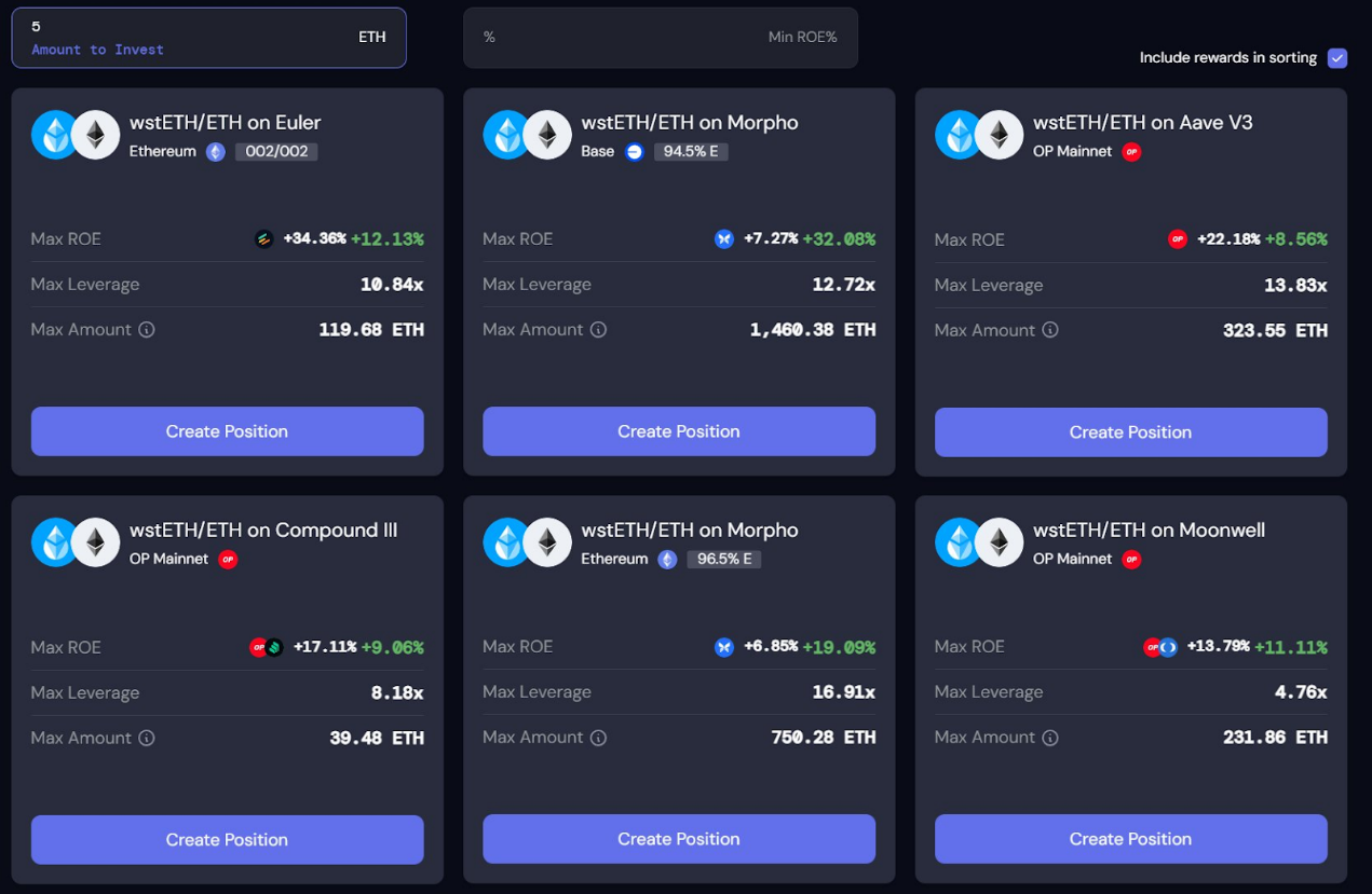 wstETH策略是目前最受欢迎、最具竞争力和可扩展性的策略之一,即使在熊市,APR通常也在8%到30%之间。该策略利用ETH质押收益抵消借贷成本。 操作平台包括Morpho Labs、Aave、Compound Growth和Euler Labs,目前APR约在26%到46%之间。 此外,利用Contango等工具可以获得额外收益,例如TANGO积分和OP emissions。