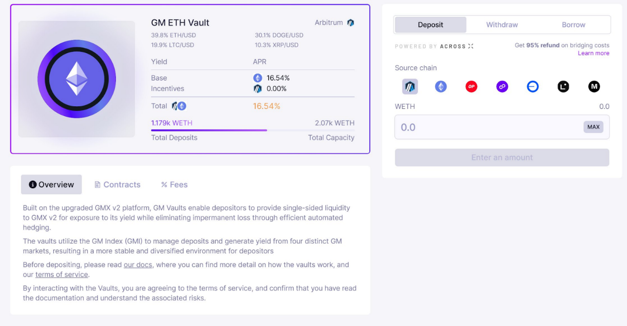 gmETH策略存在争议,因为它曾经历过本金损失。 该策略利用GMX交易者的超额收益,收益与ETH价格波动相关。 在Dolomite平台上,目前APR约为30%,历史平均APR约为20%。