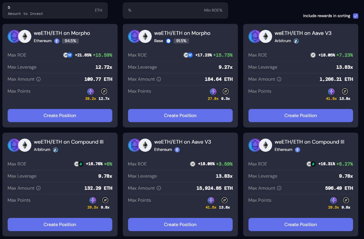 该策略与wstETH类似,但可额外获得ether.fi、Veda和LRT2积分以及EigenLayer的奖励(如$LRT2)。 最佳操作平台为Compound Growth、Aave和Morpho Labs。 不计积分奖励,APR在22%到36%之间;计入积分奖励后,实际收益率可能超过50%。 在不同平台之间对冲可以获得更稳定和更高的APR。
