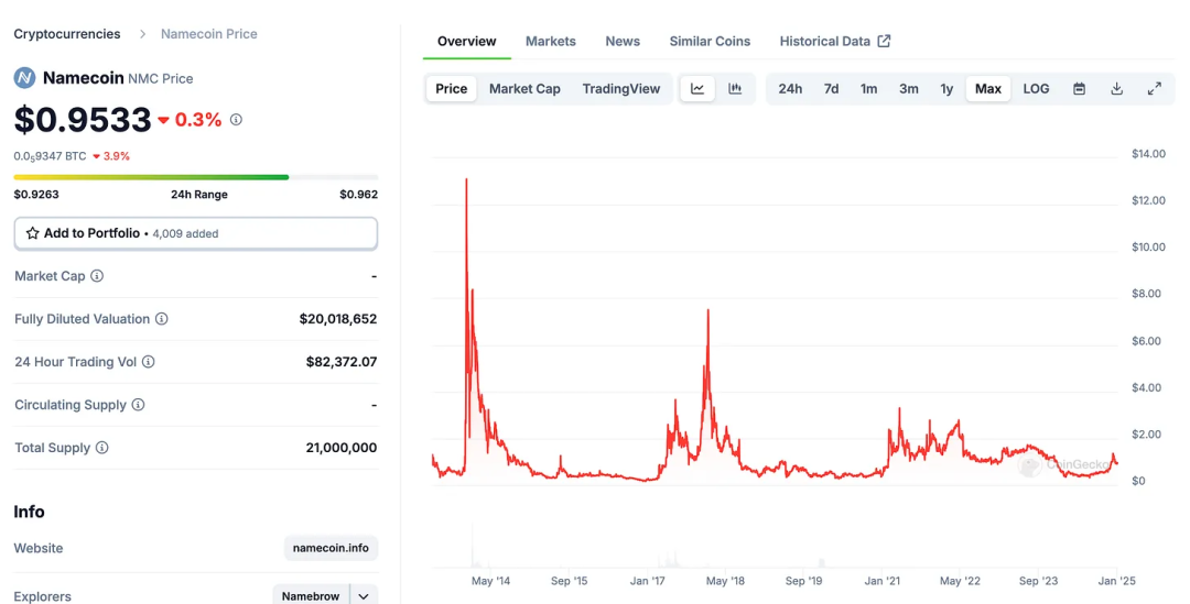 - Namecoin: 旨在创建去中心化域名系统,价格一度飙升至约13美元,随后回落。