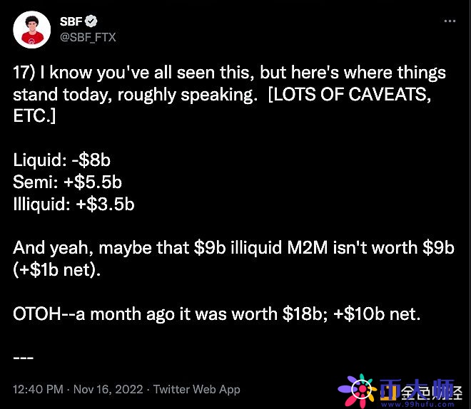 SBF 表示,或许现在 90 亿美元半/非流动性资产(按市值计价,10 亿美元净值)不值 90 亿美元。但这些资产在一个月前值 180 亿美元(100 亿美元净值)。
