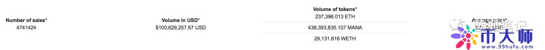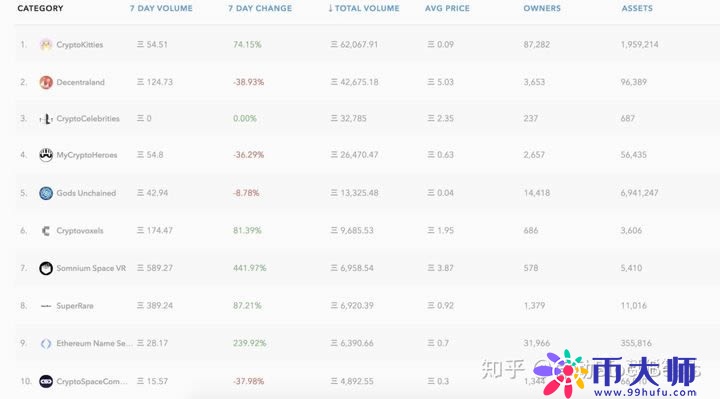 在 Opensea 上,NFT 项目达到 706 个,有 1ETH 交易量以上的项目达到 285 个,100ETH 交易量以上的项目达到 59 个,1000ETH 交易量以上的项目达到 24 个。排在前列的加密猫和 Decentraland 的交易量高达几万个 ETH。
